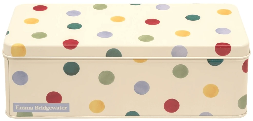 Dit Emma Bridgewater blik in de print Polka Dots is gemaakt van blik en heeft een lengte van 20 cm, een breedte van 10 en een hoogte van 9 cm. Op het blik staan stipjes afgedrukt. Gebruik de trommel om koekjes of andere etenswaren in te bewaren.