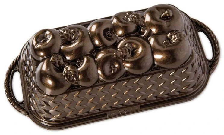 De Nordic Ware Apple Basket Loaf Pan bakvorm is gemaakt van gietaluminium en heeft een inhoud van 1,42 liter. Aan de buitenzijde heeft de vorm een bronskleurige coating en is de vorm voorzien van een motief van een mand met appels. De vorm is voorzien van een antikleeflaag, voor een eenvoudige lossing van de inhoud. Voor het bakken van cake en brood.