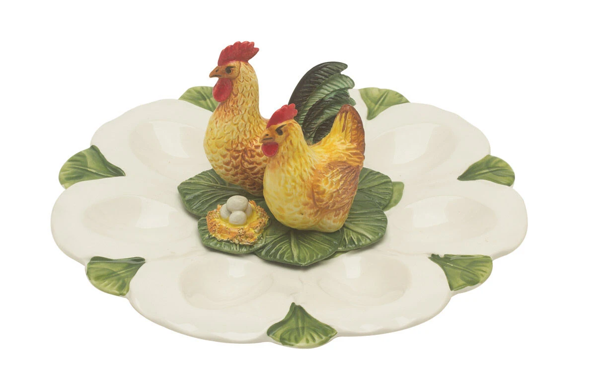 De Oldenhof ronde schaal heeft 7 uitsparingen waar u gekookte eieren in kunt leggen. Zo serveert u eieren, bijvoorbeeld tijdens Pasen, op een leuke manier. De schaal is in het midden voorzien van een haan en een kip, heeft een diameter van 25 cm en is 11 cm hoog.